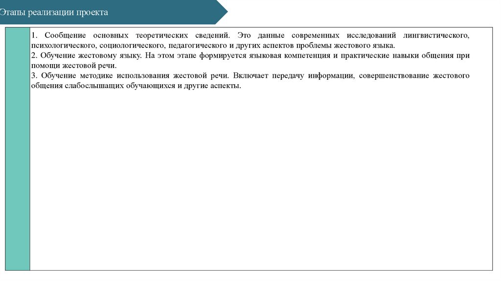 Этапы реализации проекта1. Сообщение основных теоретических сведений. Это данные современных исследований лингвистического,