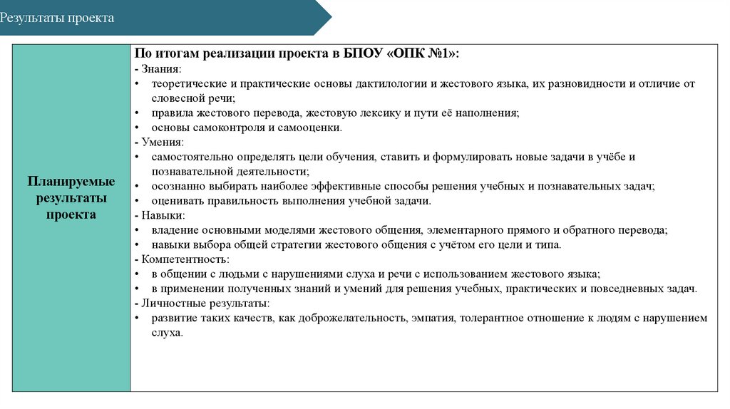 Результаты проектаПо итогам реализации проекта в БПОУ «ОПК №1»: