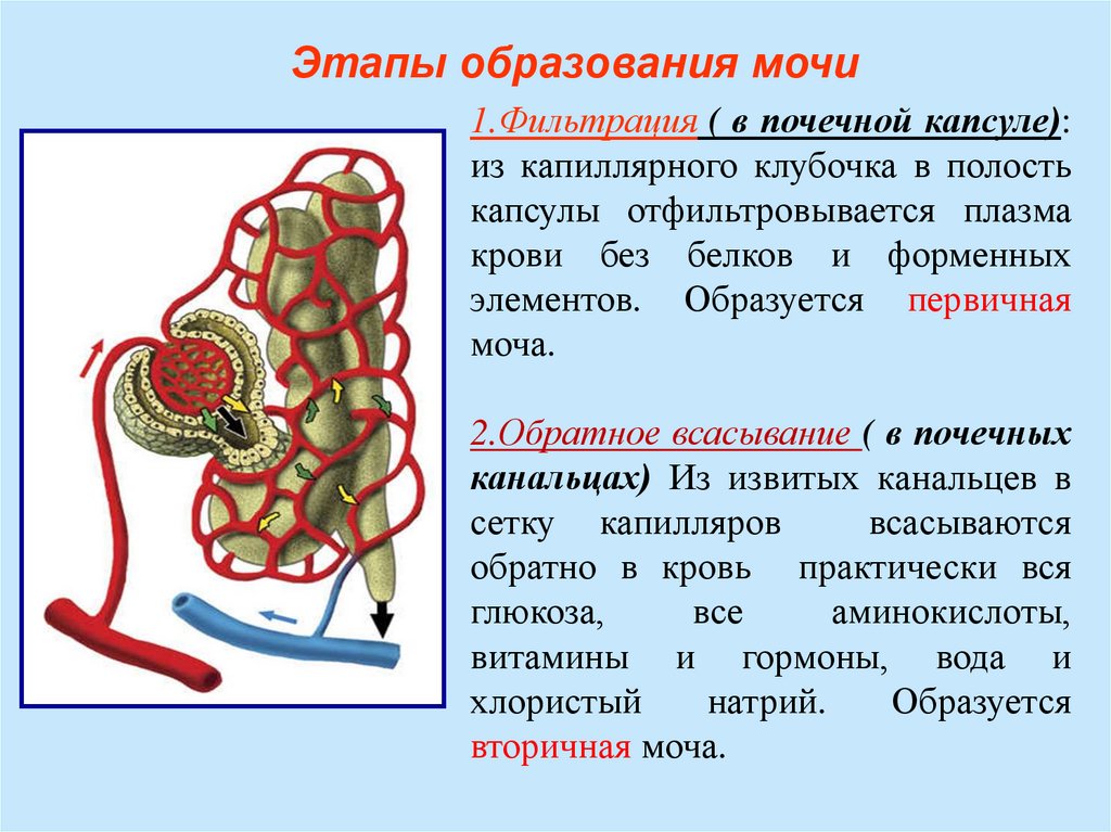 Этапы образования мочи1.Фильтрация ( в почечной капсуле):