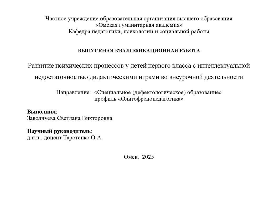 Частное учреждение образовательная организация высшего образования«Омская гуманитарная академия»