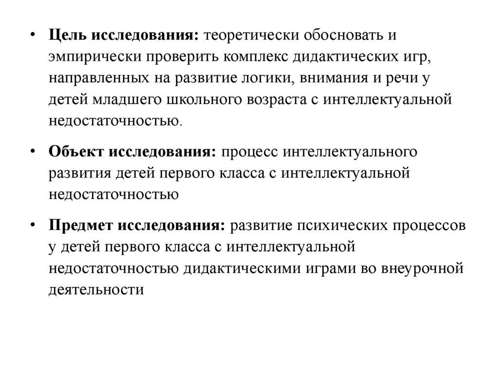 • Цель исследования: теоретически обосновать иэмпирически проверить комплекс дидактических игр,