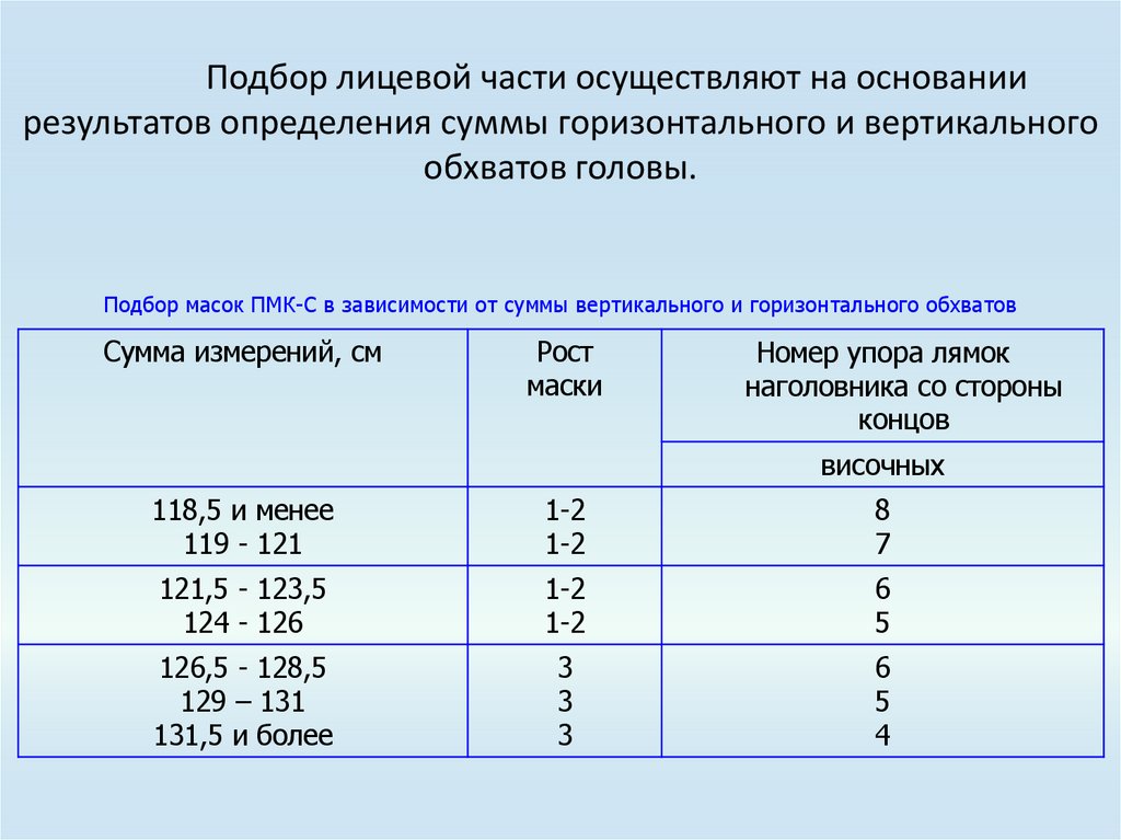 Подбор масок ПМК-С в зависимости от суммы вертикального и горизонтального обхватов