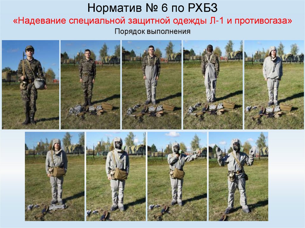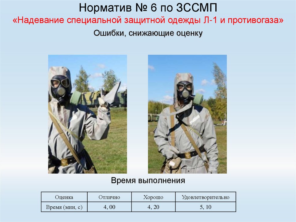 Норматив № 6 по РХБЗ«Надевание специальной защитной одежды Л-1 и противогаза»
