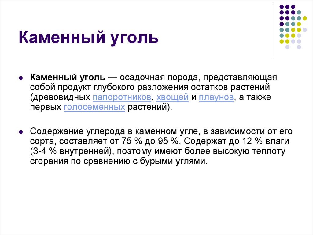 Каменный уголь — осадочная порода, представляющаясобой продукт глубокого разложения остатков растений