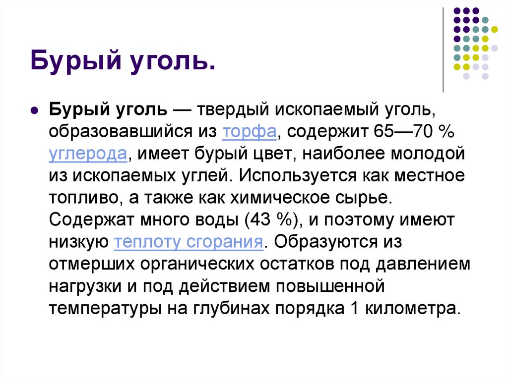 Бурый уголь — твердый ископаемый уголь,образовавшийся из торфа, содержит 65—70 %