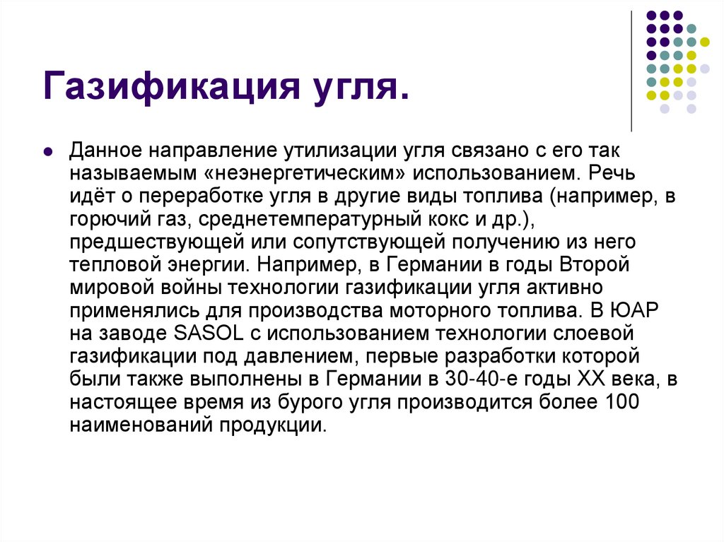 Данное направление утилизации угля связано с его такназываемым «неэнергетическим» использованием. Речь