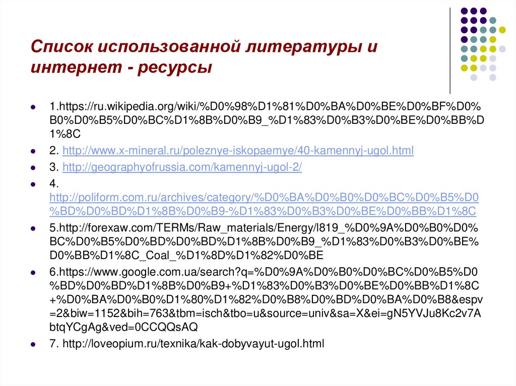 Каменный уголь10. Список использованной литературы и интернет - ресурсы