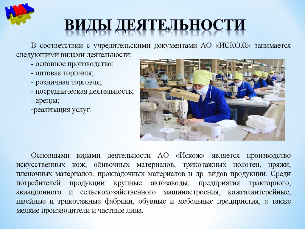 В соответствии с учредительскими документами АО «ИСКОЖ» занимаетсяследующими видами деятельности: