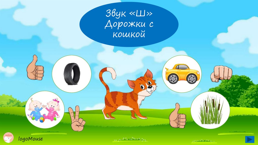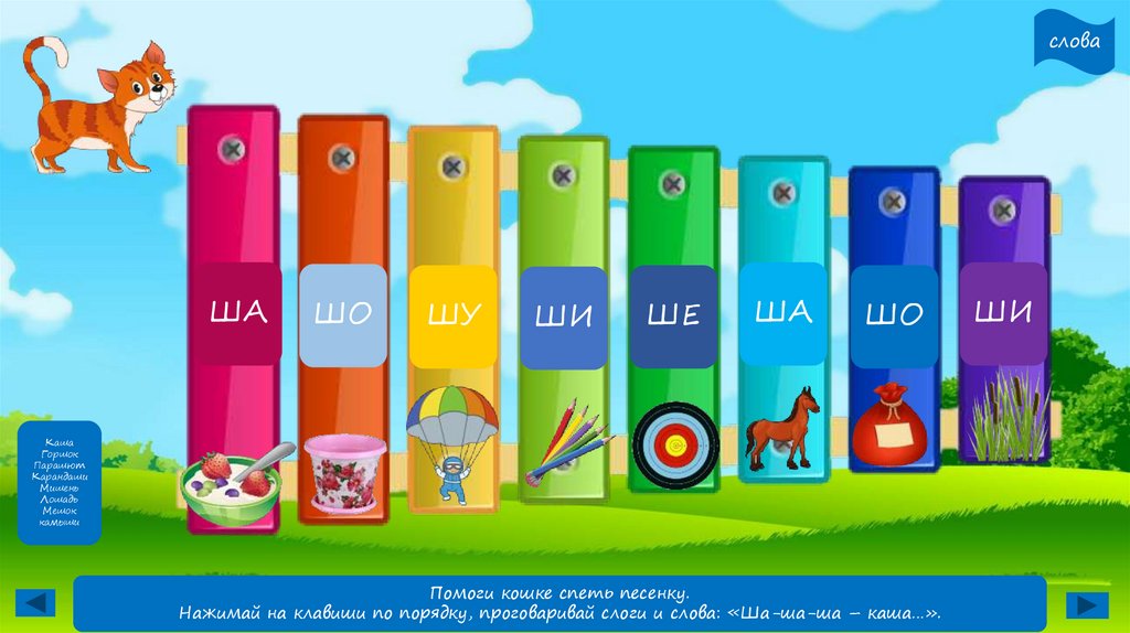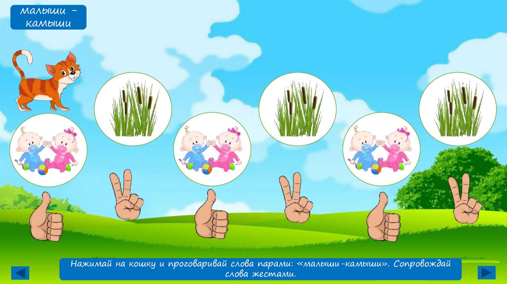 малыши камышиНажимай на кошку и проговаривай слова парами: «малыши-камыши». Сопровождай
