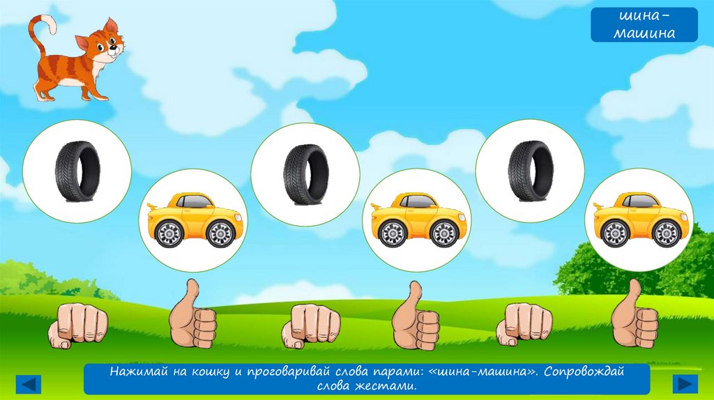 шинамашинаНажимай на кошку и проговаривай слова парами: «шина-машина». Сопровождай