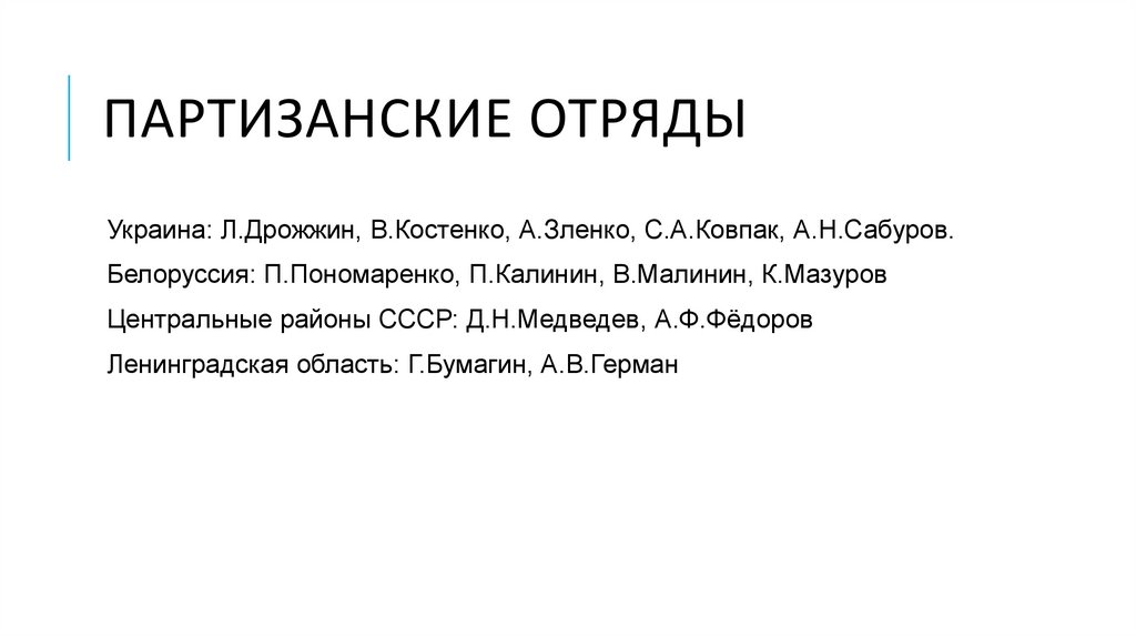 ПАРТИЗАНСКИЕ ОТРЯДЫУкраина: Л.Дрожжин, В.Костенко, А.Зленко, С.А.Ковпак, А.Н.Сабуров.