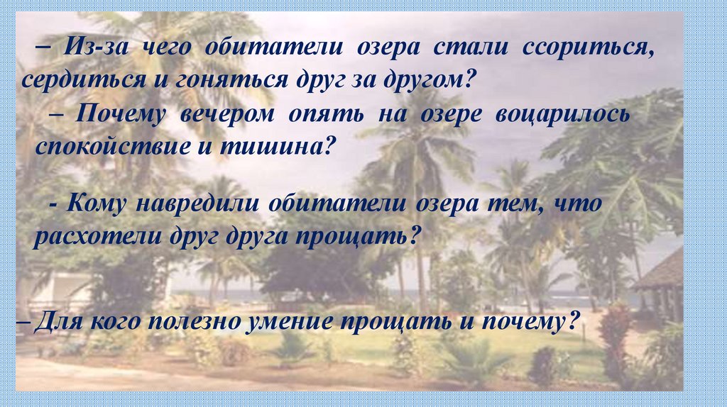 – Из-за чего обитатели озера стали ссориться,сердиться и гоняться друг за другом?