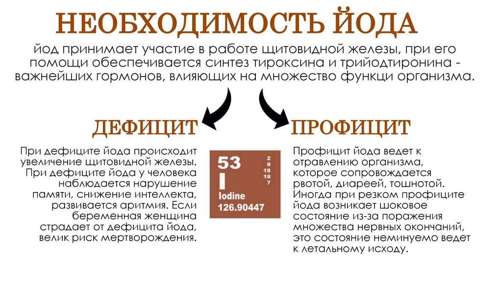 НЕОБХОДИМОСТЬ ЙОДАйод принимает участие в работе щитовидной железы, при его