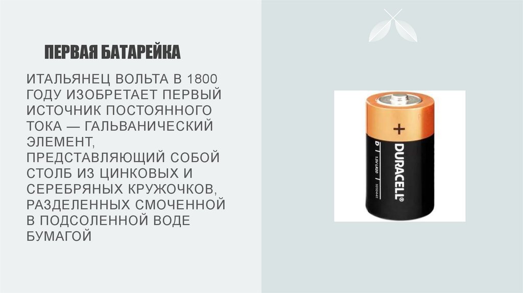 ПЕРВАЯ БАТАРЕЙКАИТАЛЬЯНЕЦ ВОЛЬТА В 1800