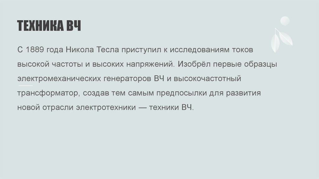 ТЕХНИКА ВЧС 1889 года Никола Тесла приступил к исследованиям токов
