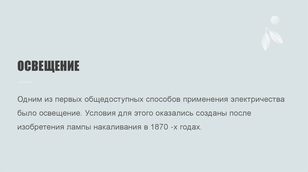 ОСВЕЩЕНИЕОдним из первых общедоступных способов применения электричества