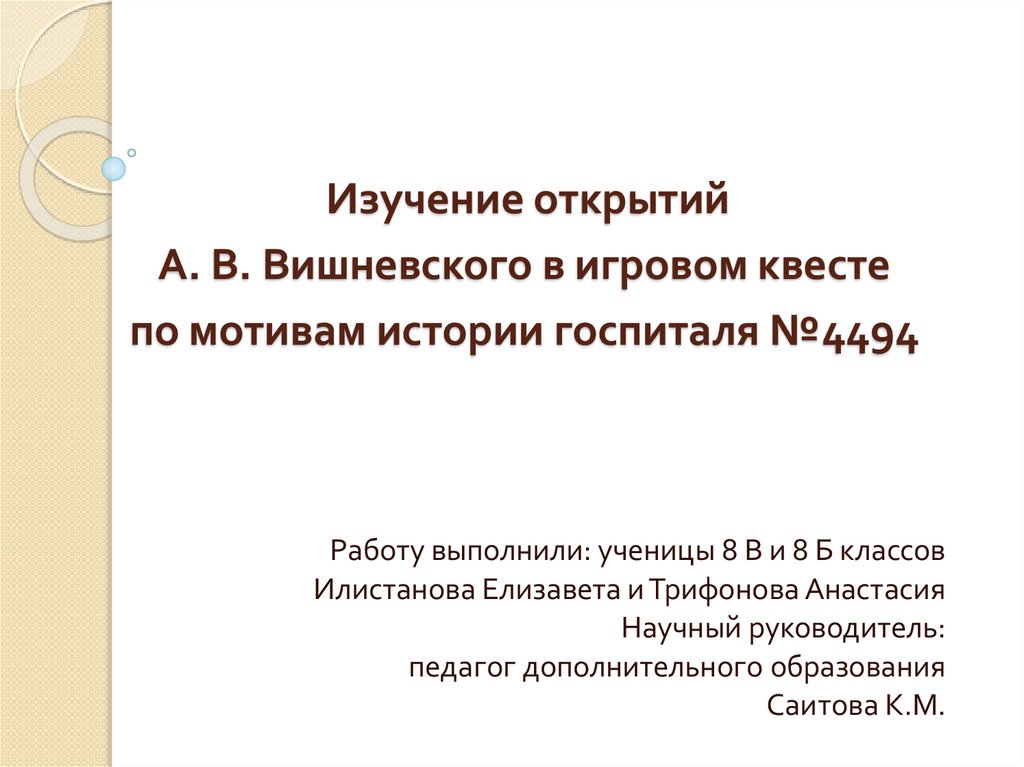 Изучение открытий А.В. Вишневского в игровом квесте по мотивам истории госпиталя №4494