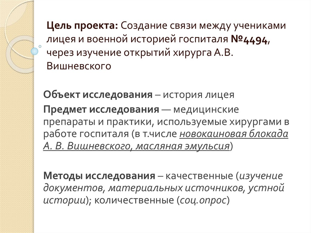 Цель проекта: Создание связи между ученикамилицея и военной историей госпиталя №4494,
