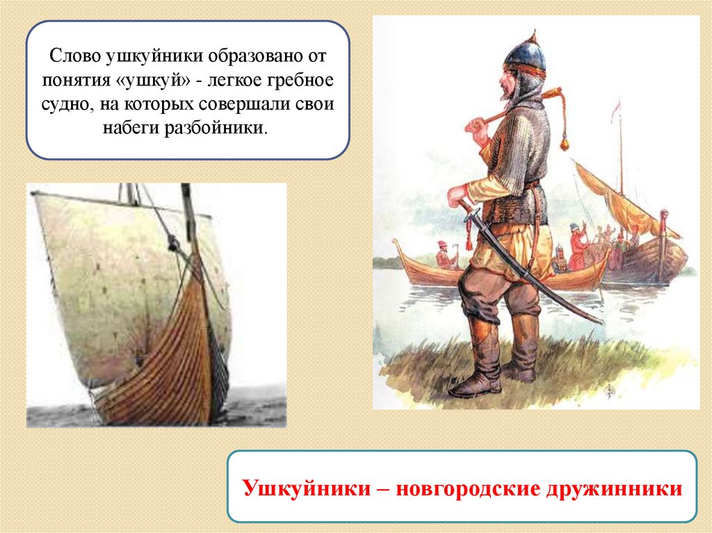 Слово ушкуйники образовано отпонятия «ушкуй» - легкое гребное