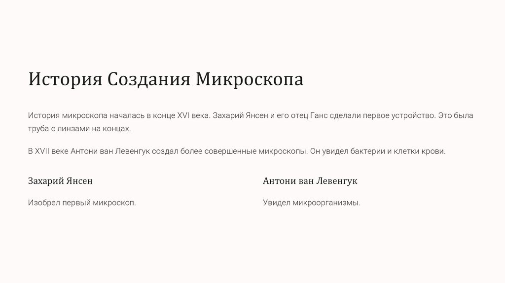 История Создания МикроскопаИстория микроскопа началась в конце XVI века. Захарий Янсен и его отец Ганс сделали первое устройство. Это была