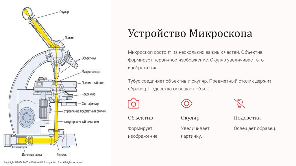 Устройство МикроскопаМикроскоп состоит из нескольких важных частей. Объектив