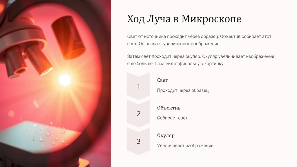 Ход Луча в МикроскопеСвет от источника проходит через образец. Объектив собирает этот