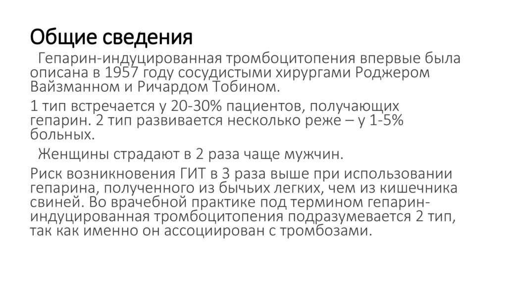 Общие сведенияГепарин-индуцированная тромбоцитопения впервые была