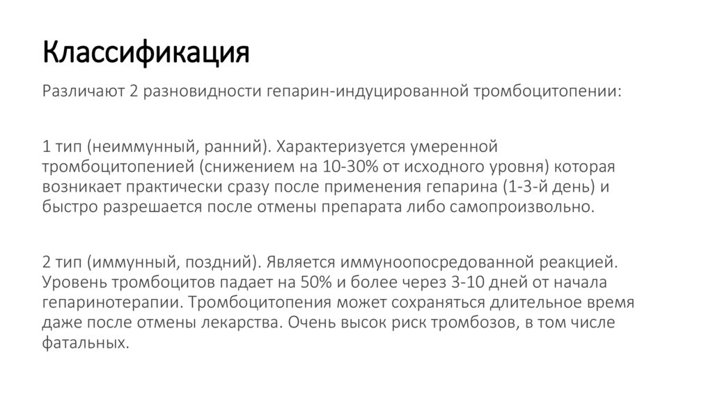 КлассификацияРазличают 2 разновидности гепарин-индуцированной тромбоцитопении: