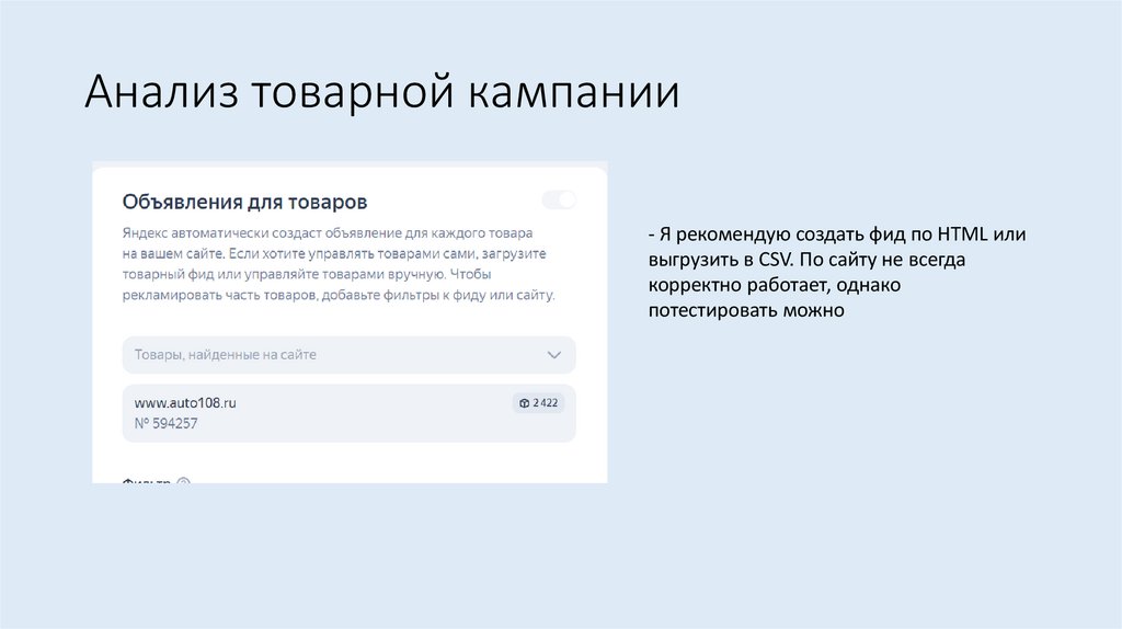 Анализ товарной кампании- Я рекомендую создать фид по HTML или