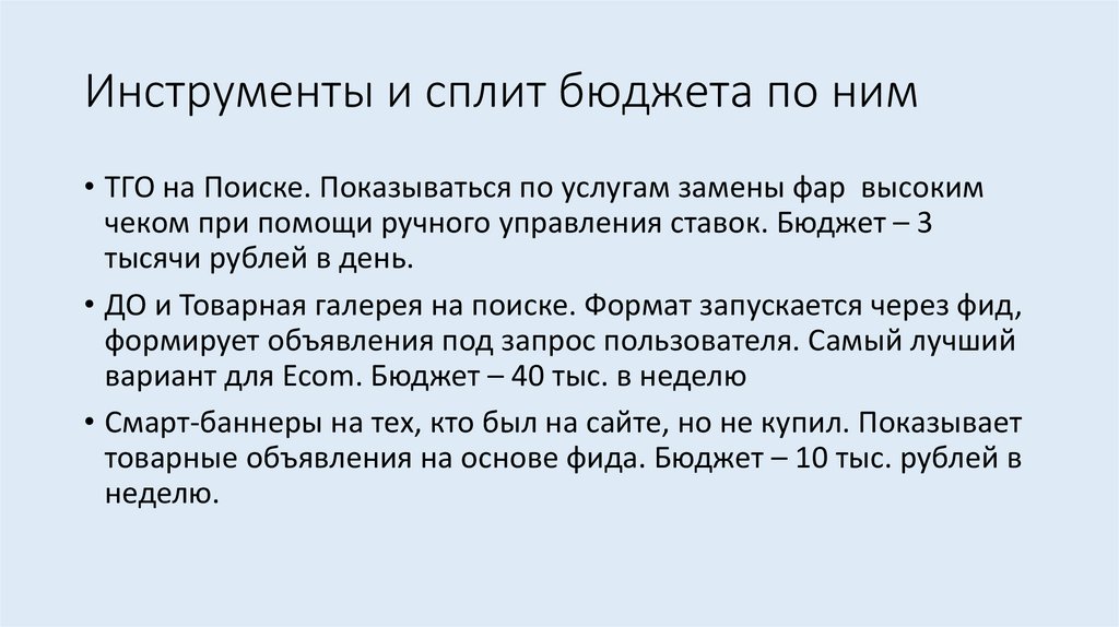 Инструменты и сплит бюджета по ним• ТГО на Поиске. Показываться по услугам замены фар высоким