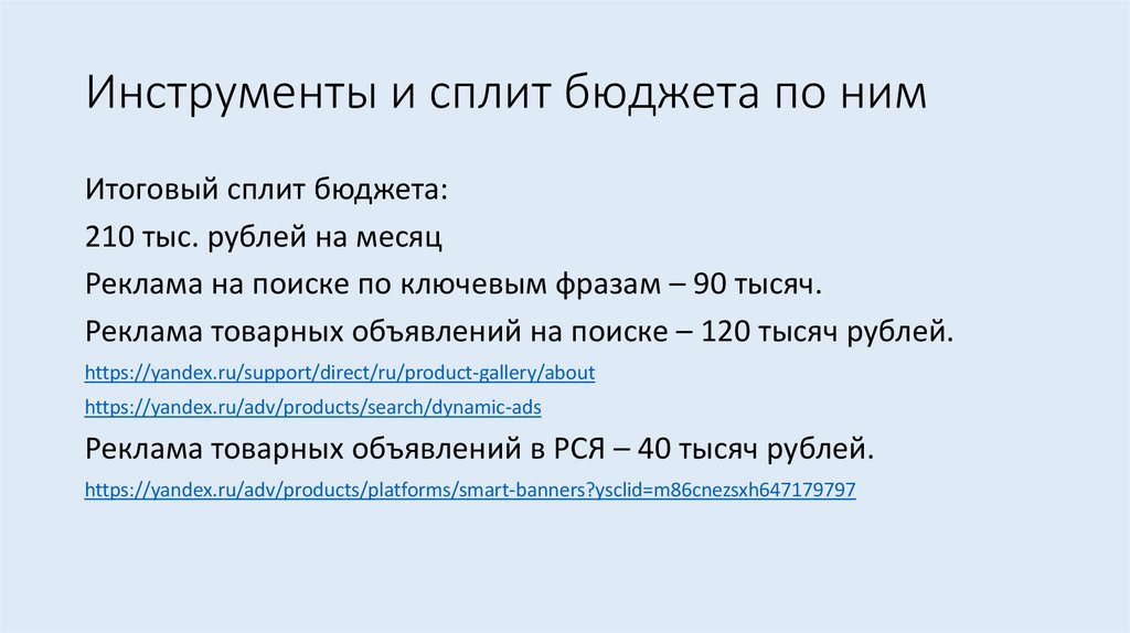 Инструменты и сплит бюджета по нимИтоговый сплит бюджета: