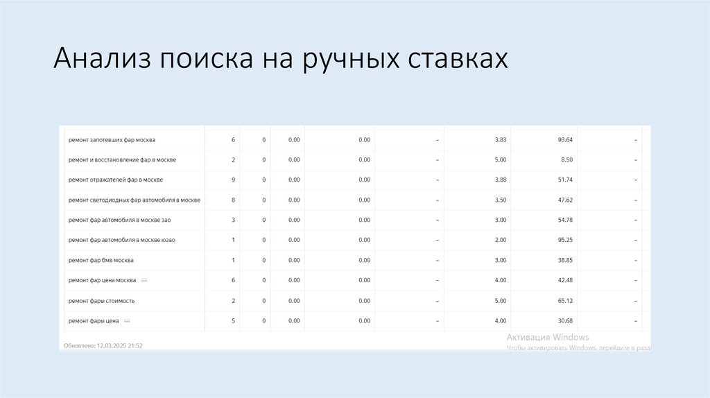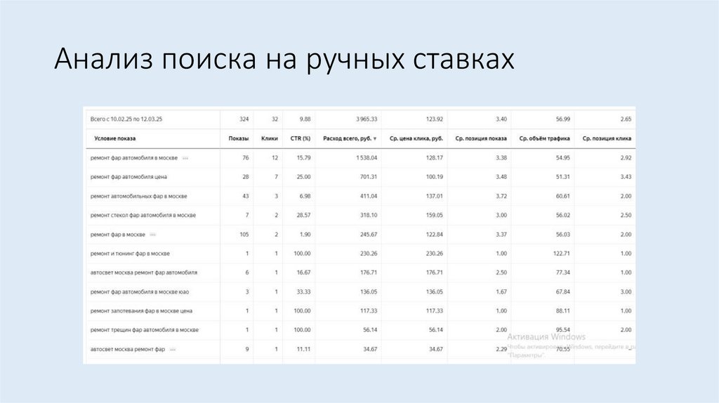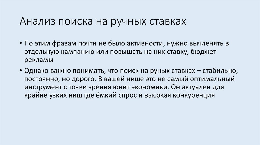 Анализ поиска на ручных ставках• По этим фразам почти не было активности, нужно вычленять в