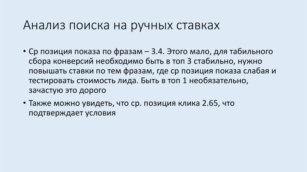 Анализ поиска на ручных ставках• Ср позиция показа по фразам – 3.4. Этого мало, для табильного