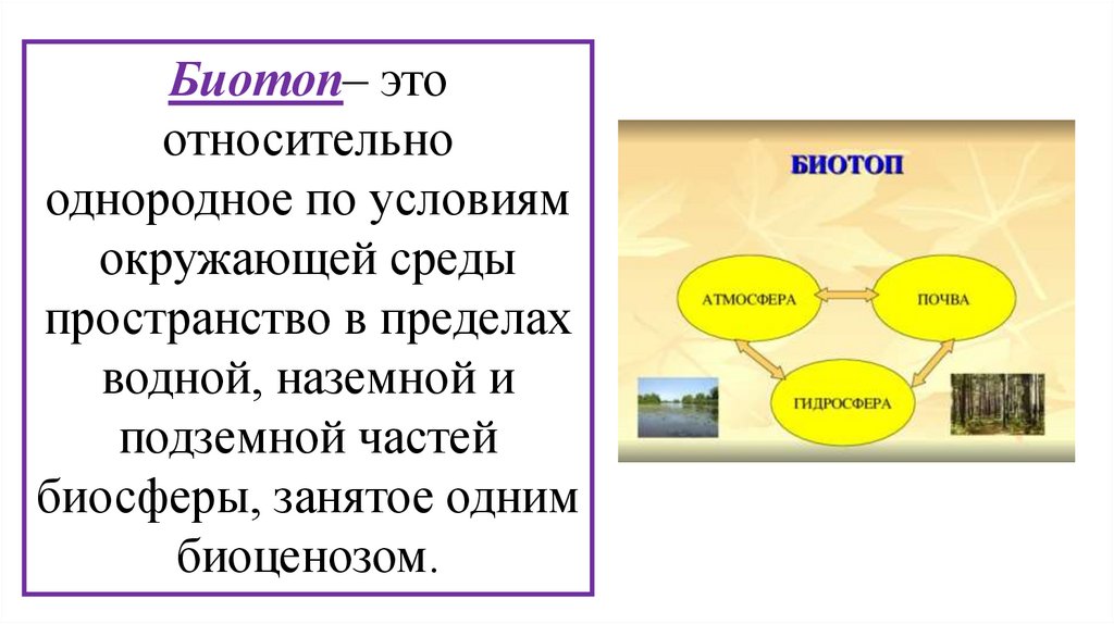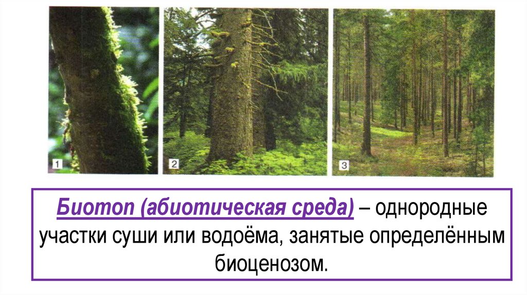Биотоп (абиотическая среда) – однородныеучастки суши или водоёма, занятые определённым