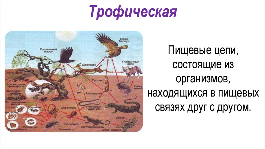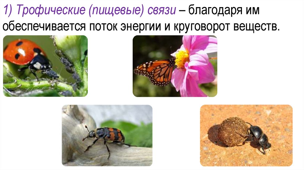 1) Трофические (пищевые) связи – благодаря имобеспечивается поток энергии и круговорот веществ.