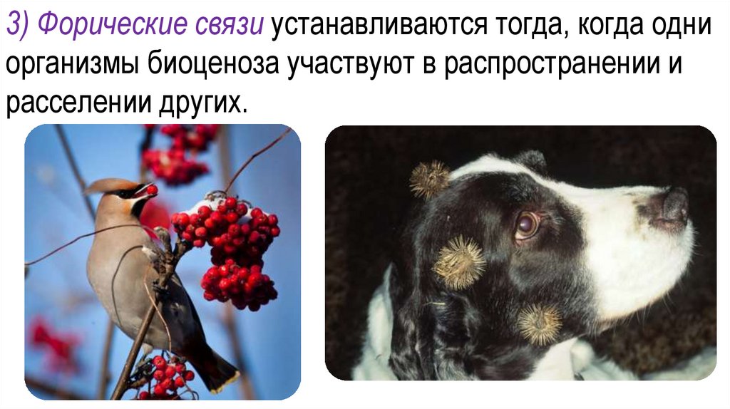 3) Форические связи устанавливаются тогда, когда одниорганизмы биоценоза участвуют в распространении и