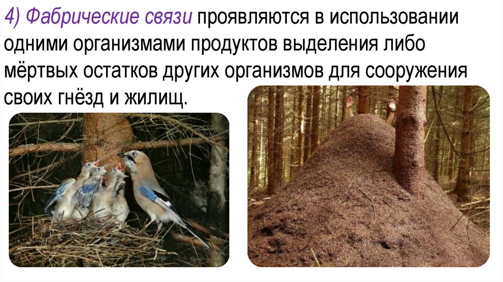 4) Фабрические связи проявляются в использованииодними организмами продуктов выделения либо