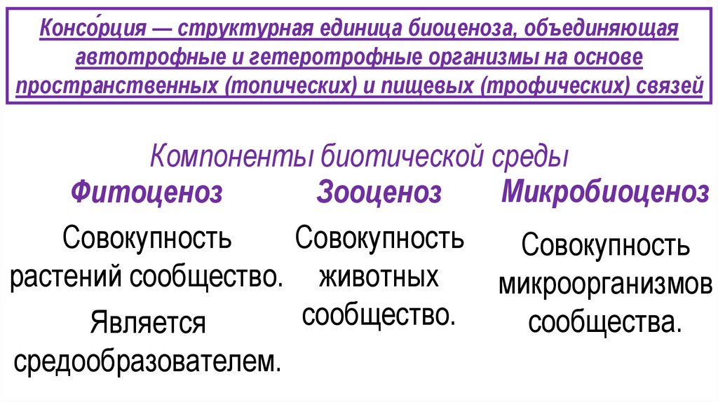 Консо́рция — структурная единица биоценоза, объединяющаяавтотрофные и гетеротрофные организмы на основе