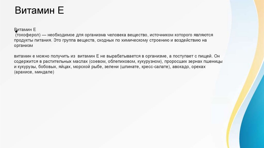 витамин е можно получить из витамин Е не вырабатывается в организме, а поступает с пищей. Он