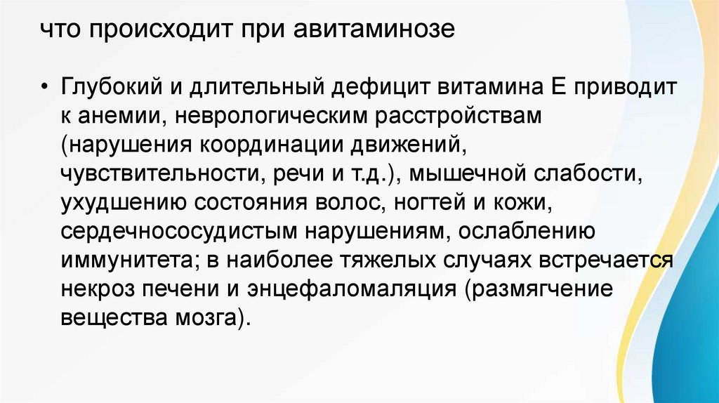 что происходит при авитаминозе• Глубокий и длительный дефицит витамина Е приводит
