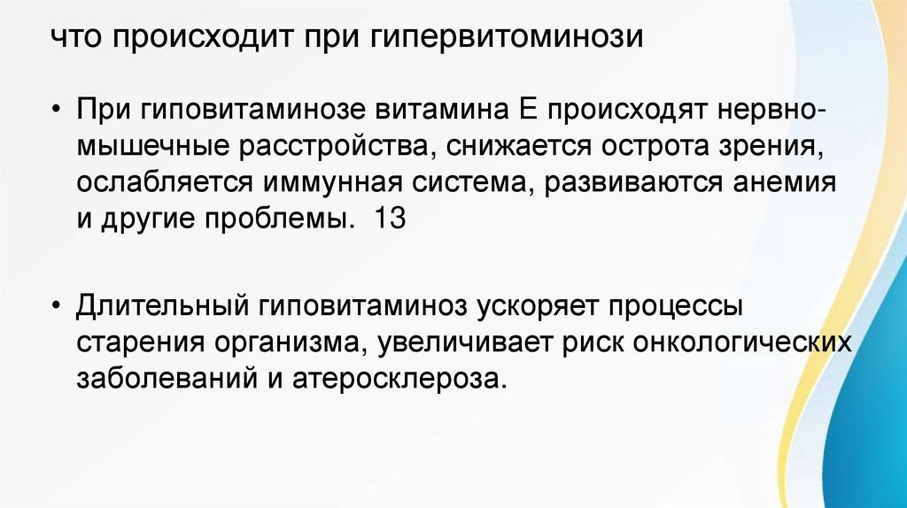 что происходит при гипервитоминози• При гиповитаминозе витамина E происходят нервномышечные расстройства, снижается острота зрения,