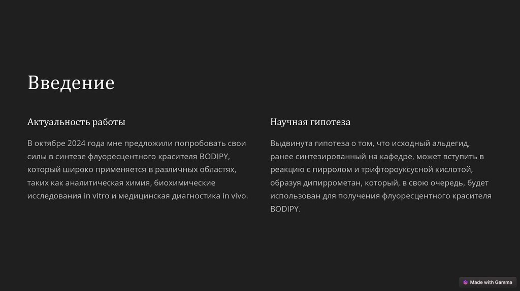 Синтез органического вещества. Синтез дипиррометана с последующим получением фрагмента BODIPY на базе РУДН