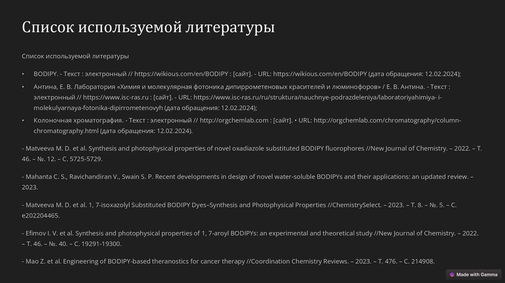 - Matveeva M. D. et al. Synthesis and photophysical properties of novel oxadiazole substituted BODIPY fluorophores //New Journal of Chemistry. – 2022. – Т.
