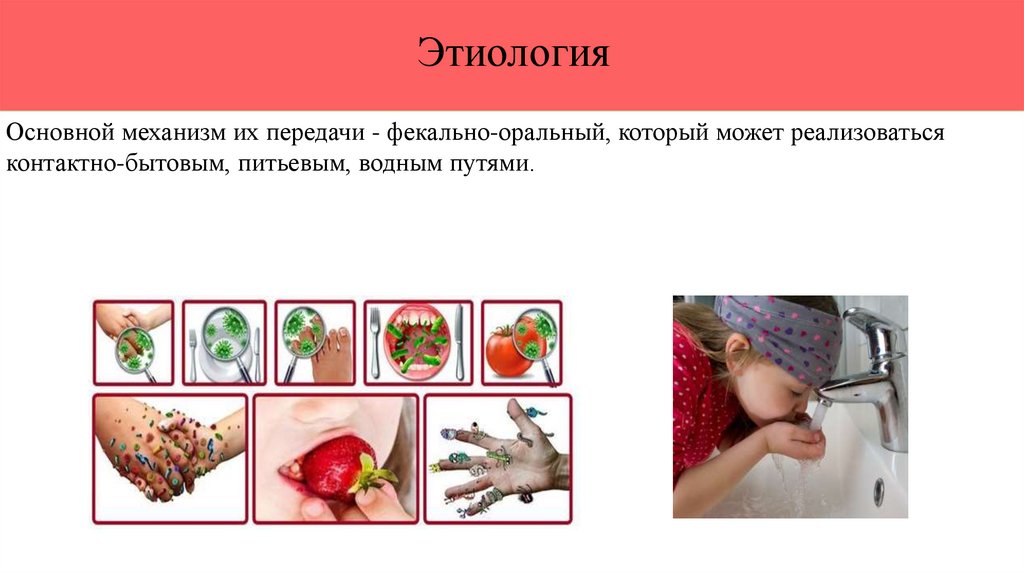 ЭтиологияОсновной механизм их передачи - фекально-оральный, который может реализоваться