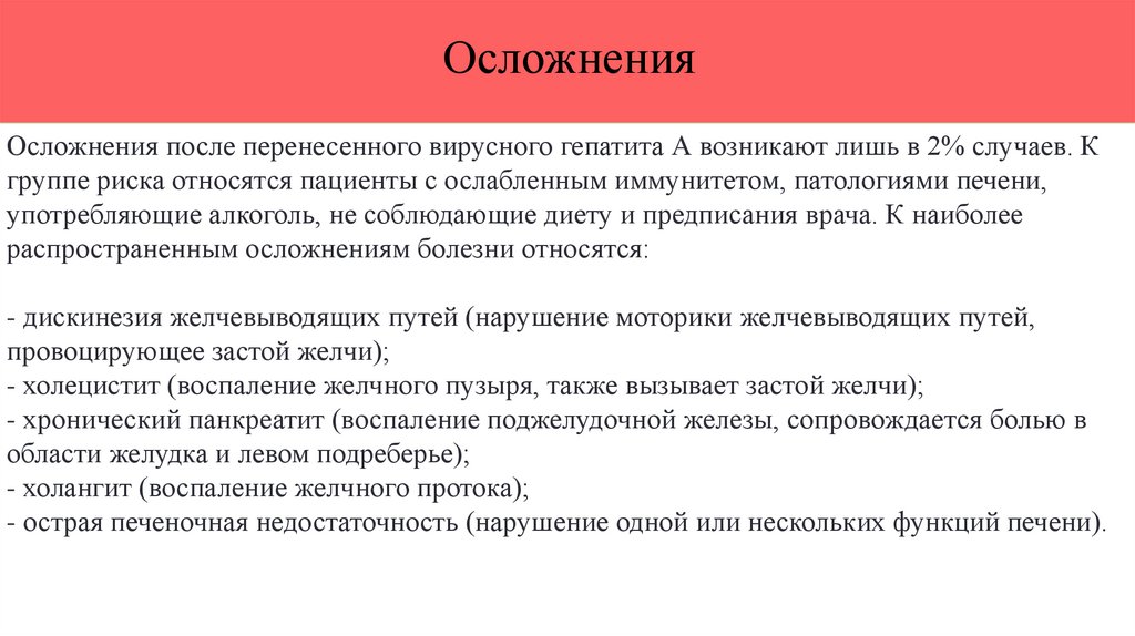 ОсложненияОсложнения после перенесенного вирусного гепатита А возникают лишь в 2% случаев. К