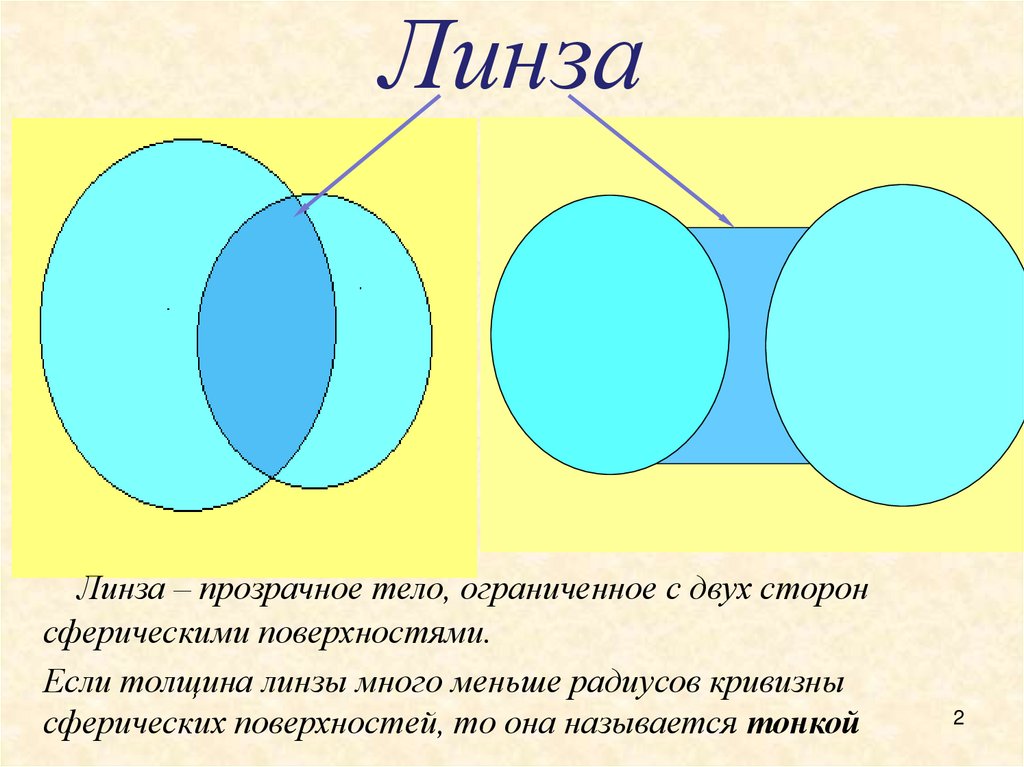 Линза – прозрачное тело, ограниченное с двух сторонсферическими поверхностями.