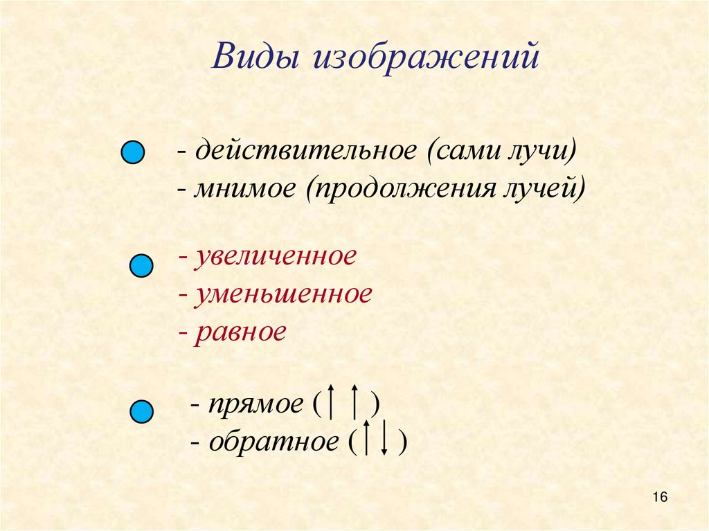 - действительное (сами лучи)- мнимое (продолжения лучей)