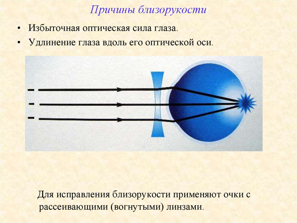• Избыточная оптическая сила глаза.• Удлинение глаза вдоль его оптической оси.