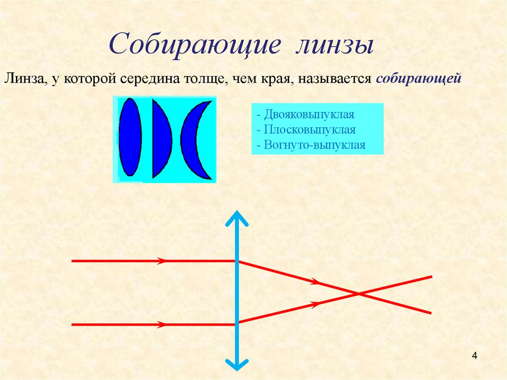 Линза, у которой середина толще, чем края, называется собирающей- Двояковыпуклая