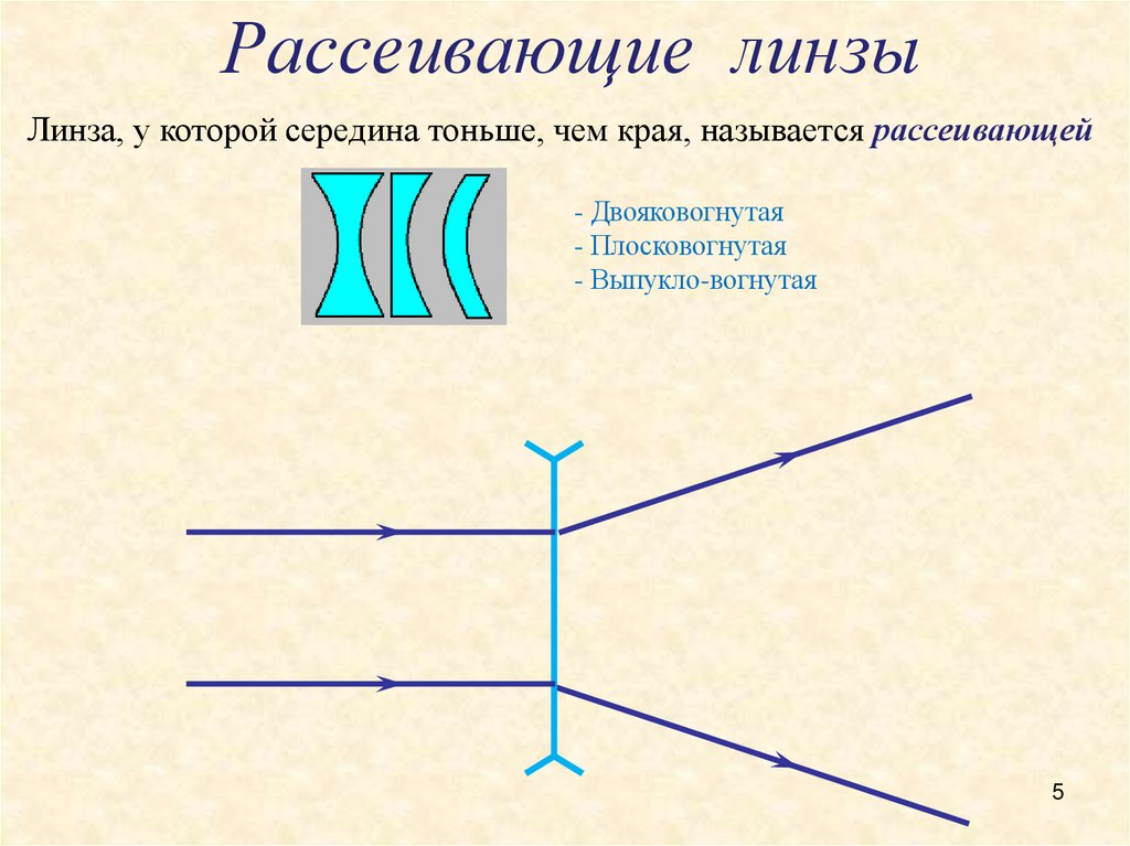 Линза, у которой середина тоньше, чем края, называется рассеивающей- Двояковогнутая